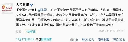 “老人老办法,新人新办法”。陕西省公安厅副厅长陈里微博告诫“拆老坟搞开发的事当慎!”,他认为:自古平挖祖坟是最不得人心的事情,丧葬文化是现代人异国他乡千里寻亲为的是一份缅怀祖宗的情怀。遵从民意妥善处置老坟,合理规划现代公墓,百姓是会接受的。《人民日报》法人微博转发此条言论,并赞“中国好声音”。