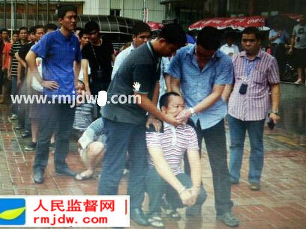 现场目击者告诉人民监督网记者,特警从防暴车内将富星商贸广场房产开发(惠州)有限公司董事长胡伟星押至一楼广场,胡伟星向大楼内叫喊道:“共产党抓错人了。”就在这一刹那,两位特警几乎同时用手掌捂住了胡伟星的嘴巴,另一特警迅速用胶粘带将胡伟星的嘴巴封住并按住头部蹲下。