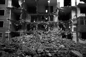 山西太原市解放路西二道巷内的平民路黄河开发小区一片断壁残垣的清冷景象。按照规划,该地属于旧城改造拆迁范围,小区内的公共设施已基本被拆除。10栋楼,已有2栋成了废墟,其余都有不同程度损坏。