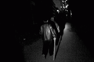 居民自发组成的巡逻队围着“拆迁楼”巡夜。队员中年龄最大的70多岁。