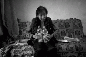由于没有暖气,腿脚不便的张大姐将烧开的水装进塑料瓶,以此取暖。