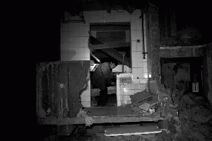刘先生从被木板遮蔽的一处缝隙中挤进楼门,回到自己的家。