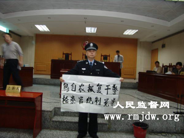 人民监督网讯:(记者朱瑞峰湖北襄樊电)2008年10月9日9点,在湖北省襄樊市中级人民法院地下审判一庭(地下室),湖北省襄南监狱一级警督张德勇头戴警徽、身着警服端坐上诉席上。从法庭大门走进来的襄樊市中级人民法院审判庭审判长、审判员等三名法官及襄樊市人民检察院的两名支持公诉的检察官看到此情景,惊讶的迅速转过身来,退出法庭门外。