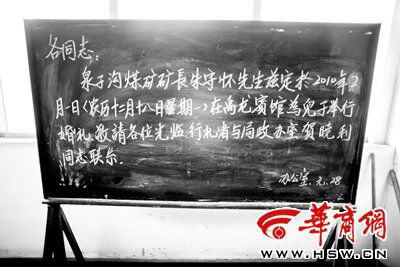 1月28日下午,在韩城市煤炭局二楼黑板上,明确通知大家行礼可与局政办室联系
