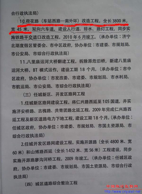 济宁市政府《济宁市人民政府关于下达2009年重点城建项目任务分工的通知》济政发(2009)9号文件第10条规定:“荷花路改造工程全长3800米,宽45米。而实际上荷花路拆迁后各段的宽度标准不一,最少的有150米,最多的达到了300多米。