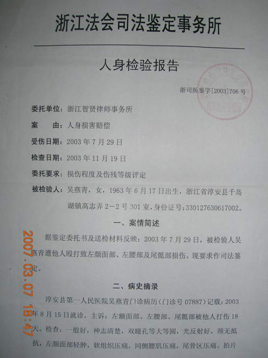 吴燕青说,自己被法官带到浙江省淳安县人民法院执行庭的一个办公室里,坐下不到二分钟,见一个人(后来经证实叫姚春妹,女,淳安县人民法院执行三科科长。)来到身边,不问青红皂白地用一个什么东西打她的头部,接着又抓住她的头发,把头按下去打,吴燕青顺手拉住她的衣角,拼命地抬起头来,看到有四、五个人在打自己,吴燕青出于本能,发现边上有一把开水瓶,就抓起来阻挡他们的拳头(抓起来后感到开水瓶里面几乎是空的,只是残留了一点水),法院执行人员边打边夺开水瓶,在争夺中开水瓶被他们夺过去时塞子掉出来,溅出几滴水到他们身上,这时法院执行人员暴跳如雷,恼羞成怒、变本加厉,几个人把吴燕青按在椅子上,姚春妹发疯似的要撕吴燕青的衣服,并大声说:“反正是街上卖的,让你们看看”,虽然吴燕青拼命挣扎,但衣服还是被撕开了。执行人员接着又把吴燕青推倒在地上拳打脚踢。吴燕青拼命喊“救命,救命”,但是这种呼救声是那么的微弱,结果被他们打得躺在地上起不来,脸上又青又肿,双眼模糊,特别是头部、腰部、屁股上痛的钻心。最后,姚春妹一把把吴燕青拎起来,连拖带拽地把她拷在厕所边上。8月15日,淳安县第一人民医院确诊吴燕青“第一尾骨骨折;左面部、腰部软组织损伤。”11月24日,浙江法会司法鉴定事务所评定吴燕青“尾一椎骨骨折、左颜面部、腰部软组织损伤,构成拾级伤残。”