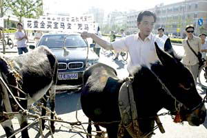 昨天北京街头上演了一出“毛驴拉宝马”的好戏,引来街头不少群众的围观。记者在西四环远大路口看到,3头黑色的毛驴已经被套好,身后的车是鼎鼎大名的“宝马760i”,周围还有六七个人手里举着白色的横幅,上面的黑色大字分外明显:“顶级宝马质量问题谁来解决”,“为中国消费者讨说法”,在3头毛驴边上还站着几个老乡,只等待宝马车主一声令下,就驱赶着毛驴奋力向前走。