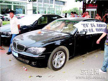 北京燕宝汽车金港4S店位于朝阳区金盏乡的金港汽车公园内。前天上午,3辆宝马将该店停车场出口封堵,车身贴着的标语称,其中的一辆M6车耗油过多,一辆Z4跑车存在右前灯进水、大灯不亮、车辆异响、车窗漏水等故障,另一辆价值140多万的740LI则出现仪表台鼓包、饰板裂痕、方向盘异响等故障。