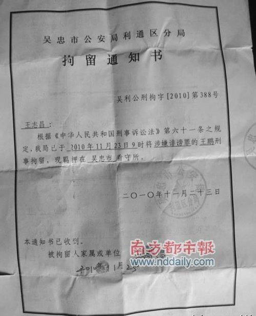 吴忠警方向王鹏父亲王志昌出示的《拘留通知书》。