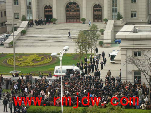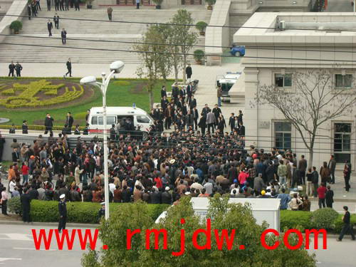 吴增仁案一审开庭当天,阴雨霏霏,近千名被挡在法院大门外的村民等候着审判的结论,整整 12 个小时。 晚上 20点40分 ,吴增仁等被告人被押上返回看守所的囚车时,数百名村民在法院大门外集体下跪,大呼冤枉,持续了约半个小时。