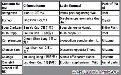 然而,在美国食品药品管理局(FDA)网站上的一个文件,记者找到了云南白药其中一款产品云南白药酊的成分表。这是一份2002年的文件,是FDA拒绝一家膳食及草药补充剂的经销商HERBMAX请求的回复。从内容看,当时HERBMAX按照美国的法规向FDA提交了一封通知信,想把云南白药酊(YunnanBaiyaoDing)作为“膳食补充剂”(dietarysupplement)。这份文件列出了“云南白药酊”的全部成分,并注明了英文名和中文名。从成分表上看,云南白药酊的具体成分为田七、冰片、散淤草、白牛胆、穿山龙、淮山药、苦良姜、老鹳草、酒精。但这样的成分表在国内是“国家保密配方”。