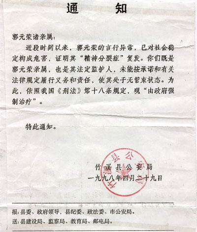 记者在网帖上看到一份1998年4月29日发布的落款为“竹溪县公安局”的通告扫描件,通告称,“近段时间以来,郭元荣的言行异常,已对社会稳定构成危害,证明其‘精神分裂症’复发,因郭元荣的家属‘未能按承诺和有关法律规定履行义务,使其处理无管束状态’,决定‘由政府强制治疗’”。网帖同时附上一份2001年12月17日茅箭医院精神科写给竹溪公安局局长的信件影印件。该影印件内容为:“贵局送我科精神病人郭元荣已住院多年,可以回家休养。另外从今年2月至今欠款近2万元,请局长和郭单位协商交住院费及出院问题,多谢。”
