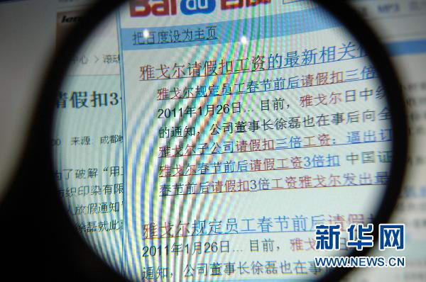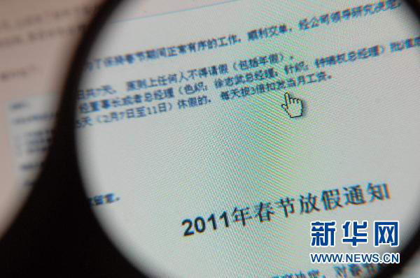 这是在网上搜索到的关于网友“徐大哥01”发帖《过年请假工资按三倍扣,是否合法?》的相关报道(1月26日摄)。春节将至,雅戈尔集团的子公司发出了一份过年放假通知,其中规定职员若在春节假期前后请假要扣3倍工资。不忿的员工把这份通知放到网上,这份通知立即被网民被称作“史上最雷人放假通知”。那么,这份事实上颇有些霸道味道的“不准请假”通知是如何出台的?而其背后又有哪些深层背景?