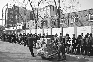 昨日,西直门的盐业公司门口,市民排队买盐。多个部门表示,北京食盐库存充足,碘盐无助防辐射,抢购没必要。本报记者 秦斌 摄