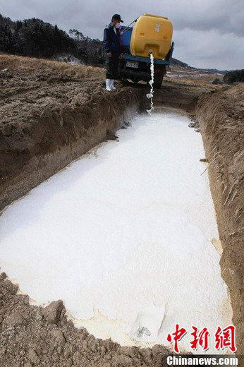 3月23日,日本福岛县Iitate,一位农民将牛奶倒入土坑中。福岛县周边地区原奶和蔬菜等农畜产品的受辐射污染范围23日呈扩大态势,首相菅直人当天首次要求人们不要食用福岛县生产的一些种类的农产品。