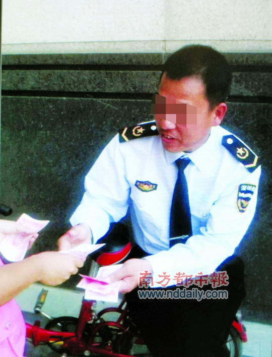 4月20日下午4点10分,在龙岗区看守所旁的一个楼盘,经过一番交代后,李姓保安接过记者的600元钱。南都记者 赵炎雄 摄