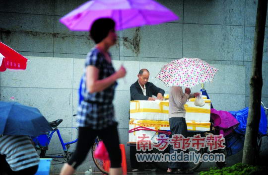 中年男子送完货,老年男子又骑着三轮自行车出发了,到了“风临城”小区大门附近,他把车停下,摊开三个馒头箱子开始摆卖,许多早起到附近小市场买菜的人都会光顾他的生意。