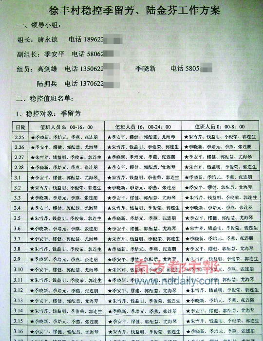 南都记者查证后发现,该微博实际上是一个名叫“季留芳”的人于5月1日发在新浪微博上的,季留芳是江苏省张家港市杨舍镇东莱办事处徐丰村村民,他在微博上提供了方案的详细照片,照片显示:2月25日—3月17日,徐丰村安排四人一组,全天24小时分三班,轮流对稳控对象季留芳“值班”。