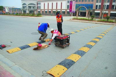 工人在事故现场路口安装减速带。曹卢杰 摄