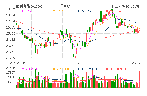 5月26日,雨润集团旗下雨润食品(01068.HK)股票收盘价26.15港元,下跌2.243%。