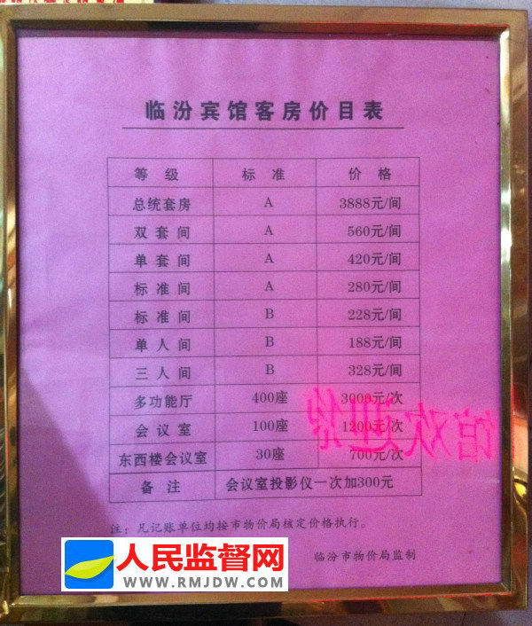 本图:临汾宾馆价目表上明码标价:总统套房3888元/天