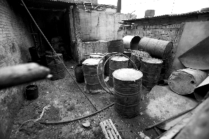 6月9日,南邑村,一家涉嫌生产伪劣食品的工厂内一角堆放着很多罐子。最近,该地数家食品厂因涉嫌生产伪劣熟食被关。
