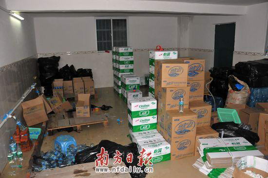 一制假团伙以出租屋为掩护,将自来水简单过滤后直接灌入塑料瓶内,并打上知名品牌标签,当矿泉水销售。日前,深圳市坪山警方成功打掉了这一制假售假团伙。据了解,今年5月下旬,深圳市坪山公安分局接到群众举报称,坪山一带存在一制售假冒矿泉水窝点。接报后,坪山警方立刻成立专案组展开调查。在辖区走访时,民警发现金碧路旁一栋7层在建农民房比较可疑。该栋楼房平时大门紧闭,没人人员出入,各个窗户均用报纸糊上,但晚上该栋楼会亮起灯光。民警观察发现,经常会有一辆人货车开到该栋农民房。经过调查民警发现,该辆车上装的都是一箱一箱的矿泉水。警方跟踪车辆,发现车上的矿泉水出了销售给周边小店之外,还会送至汤坑社区一出租屋存放。