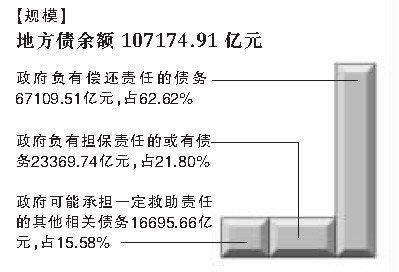 【报告摘要】 在10.7万亿地方债中,政府负有偿还责任的67109.51亿元,占62.62%;担保责任的23369.74亿元,占21.80%;可能承担一定救助责任的16695.66亿元,占15.58%。
