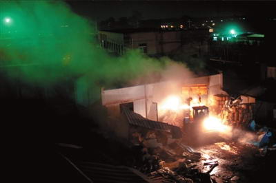 通往事发化工厂的道路已被封锁,记者来到紧贴该厂的一栋三层居民楼的顶端进行观察。该化工厂大门朝南,东侧为一处放有大型设备的车间,相连的是一间钢板房,多达上百个装有化工原料的木桶和编织袋堆放在彩钢板房下,白色浓烟正是从这里冒出。