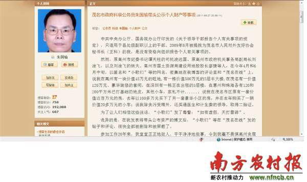 朱国瑜是茂名市外事侨务局公务员,因年初公开写下实名遗书为母申冤而闻名。2010年,朱母在与开发商发生纠纷中受伤,一个月后不治身亡。朱持续上访,当地机关对相关人员作出了行政处罚决定。朱一直坚持在网上公布茂名官场贪腐线索,7月12日和6日两次实名举报“身家过千万的副局长和官司机”。