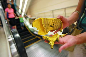 昨天下午,一儿童在朝阳大悦城商场乘扶梯时凉鞋被夹碎,其母在出事电梯前展示被夹碎的凉鞋。商场物业一员工称,扶梯本身并无问题。事发电梯—西子奥的斯电梯厂家相关负责人表示,朝阳大悦城3部飞天扶梯,由该公司负责维保,近期均有检修,未发现任何问题。记者 王贵彬 摄