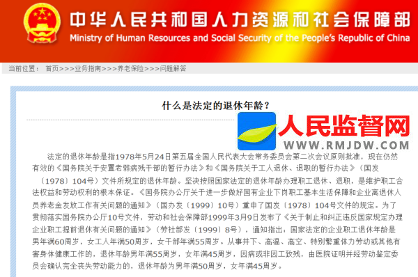 图:中华人民共和国人力资源和社会保障部法定退休年龄解答截图