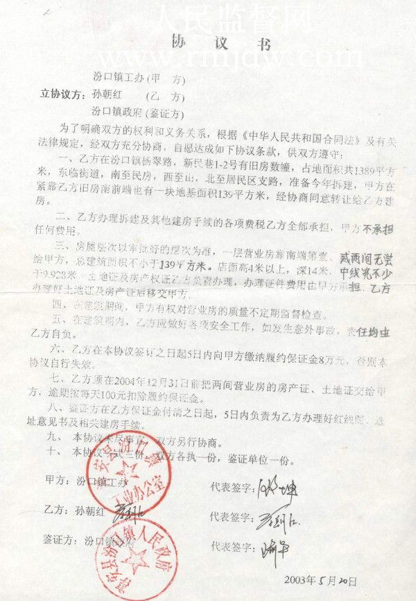 我是个下岗工人,“建房审批之路”走了两年有余还是没有着落,耗费了我大量的财力物力,负债累累。2003年3月20日汾口镇政府拟写了一份《协议书》。《协议书》肯定了我和程桂月的1389平方米的土地后,镇工办自称:除此之外在我旧房的南前端也有一块139平方米的土地转让给我建房。并以此标的,要求我无偿给镇工办两间营业用房,镇政府作为协议的见证方。协议生效后,镇政府在5日内就为我办好建房审批手续。其实我并不需要139平方米的土地,既然镇政府以强行转让139平方米的国有划拨土地作为条件,又以行政审批权力相要挟。我又有什么办法呢?同时我也知道未经国土部门批准私自、擅自转让国有划拨土地是违法的。可我一个下岗工人又能怎样?这不明摆着要想建房签也得签,不签也得签吗?无奈之下签了算吧!