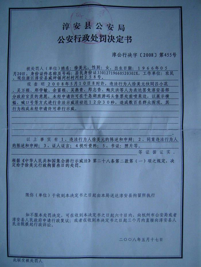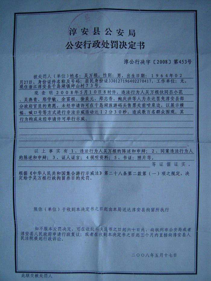 2008年5月17日,依法建议罢免官员的民众余富根、吴万根、郑学敏、吴燕青、吕小花、徐美元被淳安县公安局行政拘留3天。