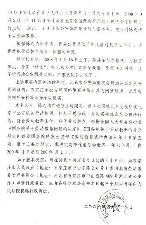从2004年至今,陈家人在上访的路上被拘留十三次之多!累计140多天!,就连陈连清70多岁,身患高血压.糖尿病的老母亲也难逃被拘留的厄运。2008年中央两会期间,陈连清再一次被拘留,在拘留所内,石家庄市公安局新华分局局长康云良和陈连清谈条件.康局长直截了当地对陈连清说:”对于你家的案子,我们拿出两套方案:一.给你四十万元,你家不能追究任何人的法律责任.签字息诉罢访;二.如果你不接受这个条件,我们就劳教你.”