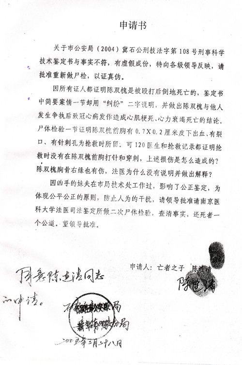 陈家人万般悲愤,无奈之下,将陈双槐的遗体在火葬场冰冻保存(保存证据),家中设下灵堂至今。陈家人就走上了为陈双槐讨回公道的上访之路.