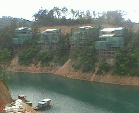 在翡翠岛的南面,正在建造一个天然游泳池,把山体“U”型环绕,可以直接在千岛湖里游泳。王洁说,因为开发商审批早、买地早,现在已不允许了。