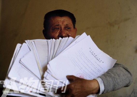 张辉的父亲张高发抱着一摞厚厚的申冤材料