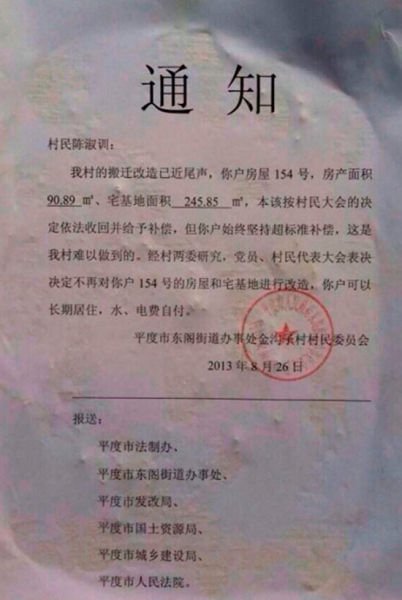 26日,金沟子村向陈宝成家下发“拒拆”通知:我村的搬迁改造已近尾声,你户(户主为陈宝成父亲陈淑训)房屋154号,房产面积90.89平米、宅基地面积245.85平米,本该按村民大会的决定依法收回并给予补偿,但你户始终坚持超标准补偿,这是我村难以接受的。经村两委研究,党员、村民代表大会表决决定不再对你户154号房屋和宅基地进行改造。你户可以继续居住,水、电费自付。