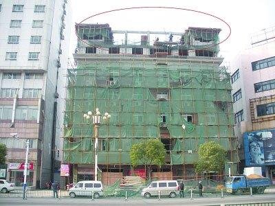 正在楼顶加盖的违建(划圈处)。 王国柱 摄 借口出新,老楼“拔高”了2层 姜堰一5层楼上加盖违建,当地规划部门多次制止无果 昨天,姜堰市民张先生反映,该市城区中心惊现一处“史上最牛的违章建筑”,有人在一座5层老式大楼楼顶上直接加盖了两层,成了“楼加加”。当地规划部门有关负责同志接受记者采访时称,他们已对面积达300多平方米的违章建筑下发了停工通知单,且两次上门拆除违章建筑,但有人继续施工。 “楼加加”位于姜堰城区中心人民中路,是该市最繁华的地区。昨天下午,记者现场发现,整幢大楼被绿色防护网和脚手架“包裹”得严严实实,施工现场一片繁忙,楼顶施工人员和地面工作人员在紧张工作,成捆的建筑材料从地面被运至楼顶。仰望上空,记者看到被“硬加”到5层楼楼顶的两层建筑,已经显出大模样。 在大楼隔壁工作的张先生告诉记者,正在施工的大楼名叫“正宏基宾馆”,建成已近10年,数年前整幢大楼卖给一名周姓老板。本来大楼楼顶有一个“假层”,两个月前,周老板在对“假层”进行改造的基础上,又加了一层。张先生担心,由于大楼已近10年,随便“加层”很可能引起安全隐患,也可能会殃及左邻右舍。正在大楼地面施工现场的一名男子称,大楼楼顶的“翻新”,是从两个月前开始的,准备在春节前完工,至于“翻新”施工有没有手续,他表示“不清楚”。 姜堰市规划局监察中队的一名队长接受记者采访时表示,他们接到群众举报后,上门进行了检查。经核查,业主楼顶上方原是一个坡形屋顶的建筑,此次业主将坡形屋顶改成平顶后,又加了一层,涉及违章建筑面积有300平方米左右,他们曾对业主下发过停工通知单,并先后两次拆除部分违章建筑,但事后业主又偷偷施工。他们规划部门已研究准备着手对业主下发处罚通知书,如果业主继续施工,不拆除违章,他们将请人帮其拆除,最后拆除费用要其“买单”。 |