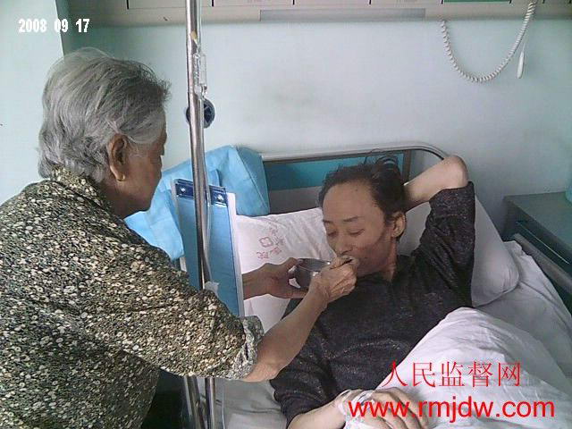 变质疫苗受害家庭八旬老人李秀兰给病危儿子喂水