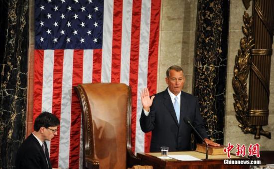 当地时间1月6日,美国新一届国会在首都华盛顿国会山开幕,上届众议长博纳击败对手成功连任。图为博纳宣誓就职。 中新社发张蔚然摄