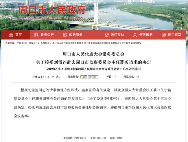 【人民监督网讯 记者朱瑞峰】2019年3月19日,周口市政府网站报道:根据刘孟连同志的请求和地方组织法、监察法的有关规定,以及全国人大常委会法工委《关于监察委员会主任职务调整有关问题的答复意见》(法工委复[2018]5号),市四届人大常委会第十五次会议决定:接受刘孟连辞去周口市监察委员会主任职务的请求并报周口市第四届人民代表大会第四次会议备案。