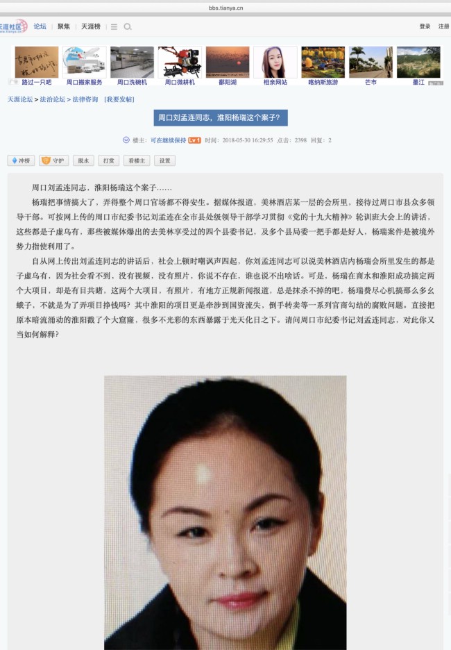 在朱瑞峰的报道中,杨瑞还牵涉到周口市纪委的一位高级干部,所以才有了杨瑞是“周口地下纪委书记”一说,事关搞掉熊县长的重大问题。请问刘孟连同志,你作为正经的周口纪委书记,对杨瑞这个不正经的“周口地下纪委书记”所牵涉到的周口市纪委里的个别同志,调查结果是什么?