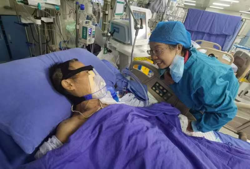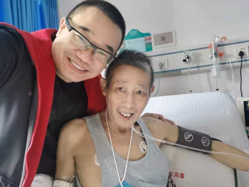 洪善德老人正在医院ICU病房进行治疗,老人的儿子洪涛和老伴代表老人接受了捐赠证书.