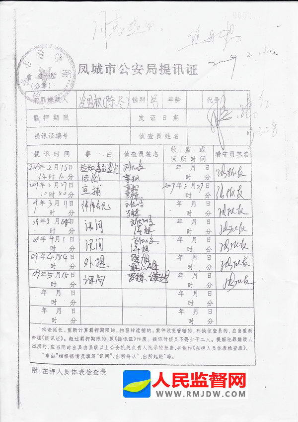 杨俊哲律师:杨律师拿着凤城市看守所提讯证对人民监督网记者说:“这份材料,法院告诉我是检察院提供的。这个注明的是他的入监时间,1月22日,这是丹东看守所的。做假的那个材料很关键,是凤城看守所出的材料。”