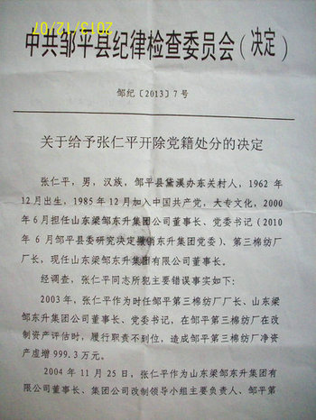 山东省邹平县黛溪办事处东关村全体村民在2007年至今,一直在举报原东关村书记张仁平侵占、贪污、变卖集体资产以及利用集体资产进行金融诈骗等犯罪事实。但在举报的多年里,张仁平的犯罪问题始终未被查处。直到2013年6月5日,邹平县委常委、纪检委书记房斌才签发文件以张仁平存在“四个方面的问题”做出了“关于给予张仁平开除党籍处分的决定”。