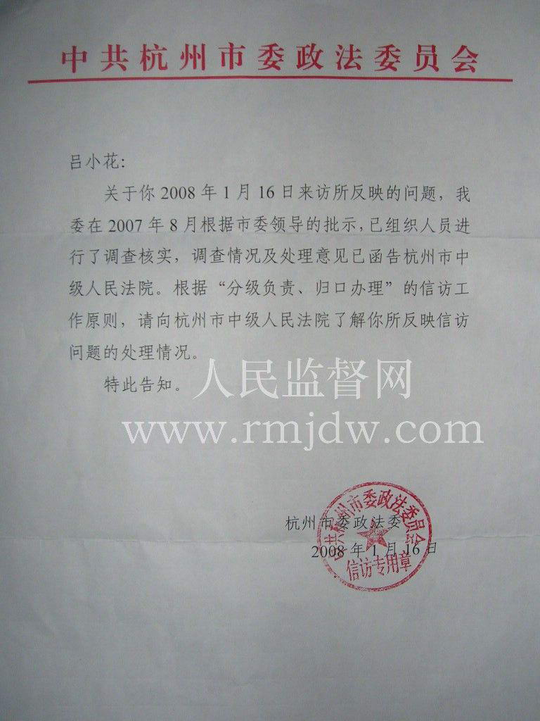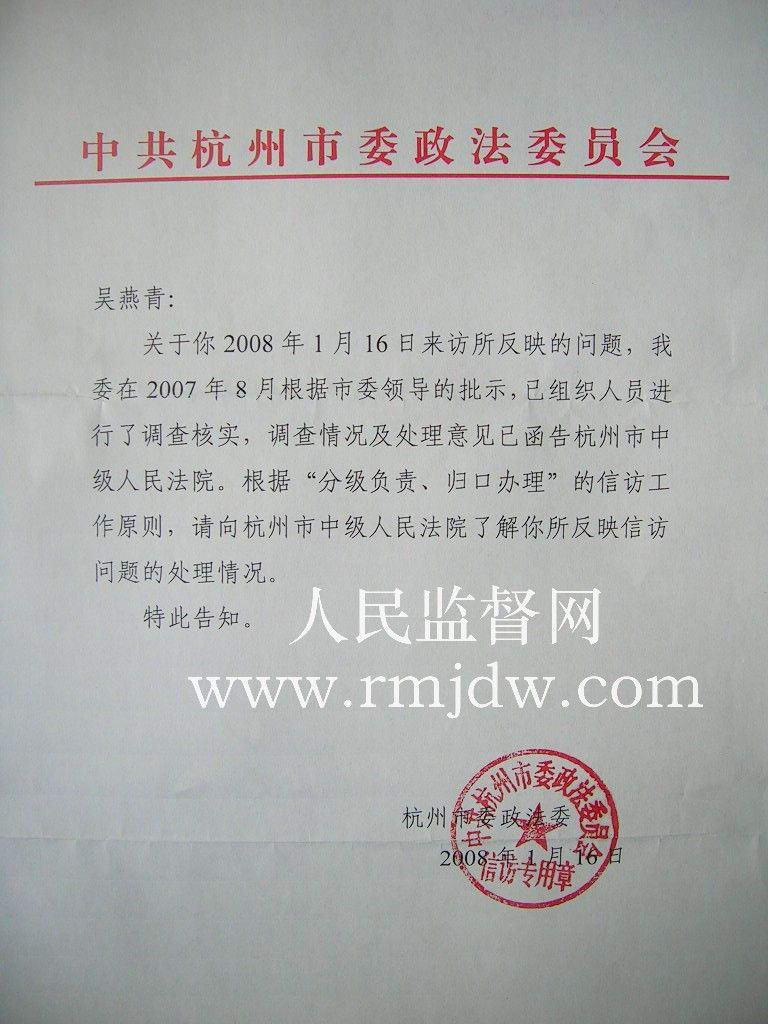 《人民监督网》的报道引起了杭州市委书记王国平、市委常委副书记王金财的高度重视,并批示市委政法委组织调查。市委政法委根据市委领导的批示,于2007年8月份组织人员进行了调查核实。但是五个多月过去了,调查人员未找过受害人,受害人也未得到调查结果和处理意见。经过受害人的多次追问,市委政法委才于2008年1月16日给受害人书面答复。答复说:“调查情况及处理意见已函告杭州市中级人民法院。根据‘分级负责、归口办理’的信访工作原则,请向杭州市中级人民法院了解处理情况。”为此,受害人只有找到中院,经过与中院的多次联系,终于有了答复。中院立案厅厅长说:“我们院长在处理,基本上要复查,我们要来找你的,具体有什么结果我会通知你。”到底复查结果会怎么样?我们只有试目以待。