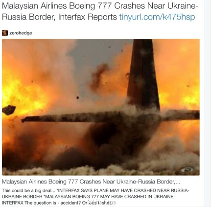 最新消息:【俄媒称坠毁马来西亚客机遭地对空导弹击落】国际文传电讯社17日援引知情人士的话报道称,坠毁的马来西亚客机在乌克兰东部大约1万米高空遭击落。